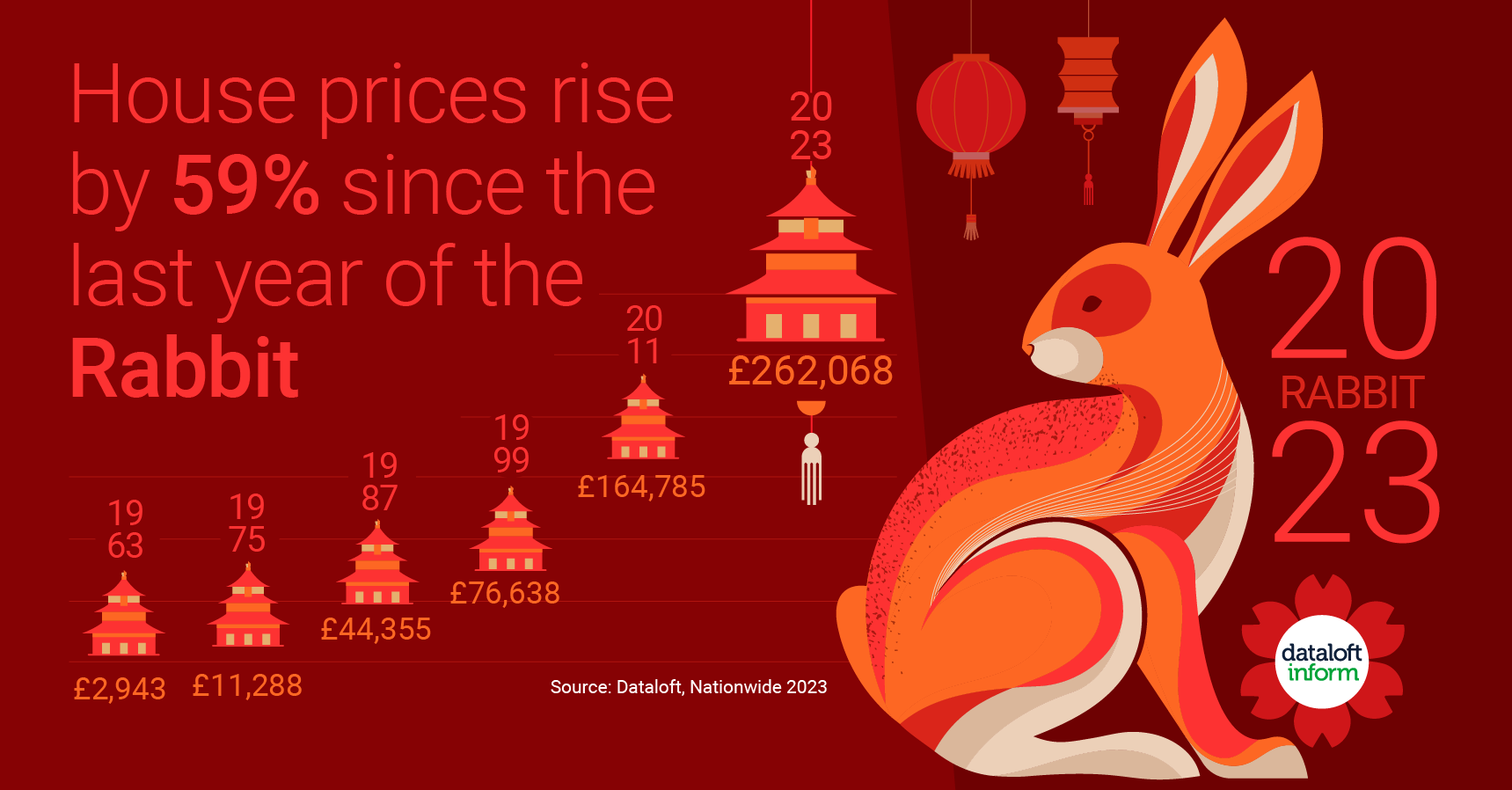 Since the last year of the Rabbit in 2011, average house prices in the UK have risen by a total of 59%, with an average annual rate of 4.5% per annum. The largest annual growth in this period was 10.1% recorded in 2021.